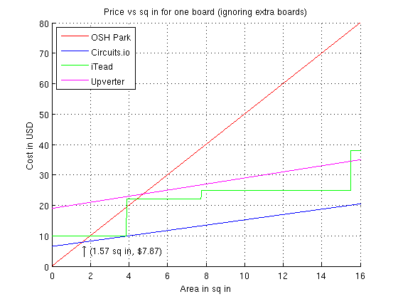 Notice in this graph that all the curves are scaled except for Upverter, which did not move at all. OSH Park and Circuits.io intersect in the same price, but with three times the area. Also notice that iTead Studio beats everyone price-wise at almost all sizes.