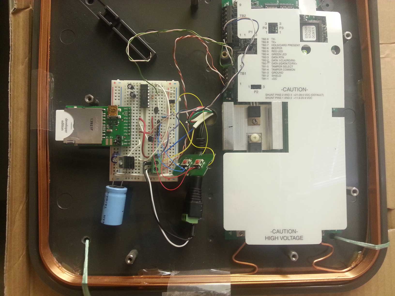 Unfinished prototype zero with Parallax reader and buzzer since the Parallax reader doesn’t beep like the HID readers.