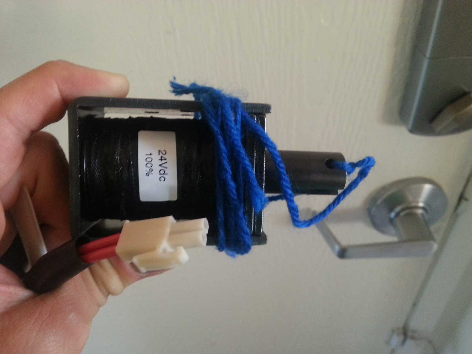 Gigantic 24V 100% duty cycle solenoids that I wanted to affix to the hinge of the door so that they could pull the deadbolt open. Uses string to keep the bolt in place.