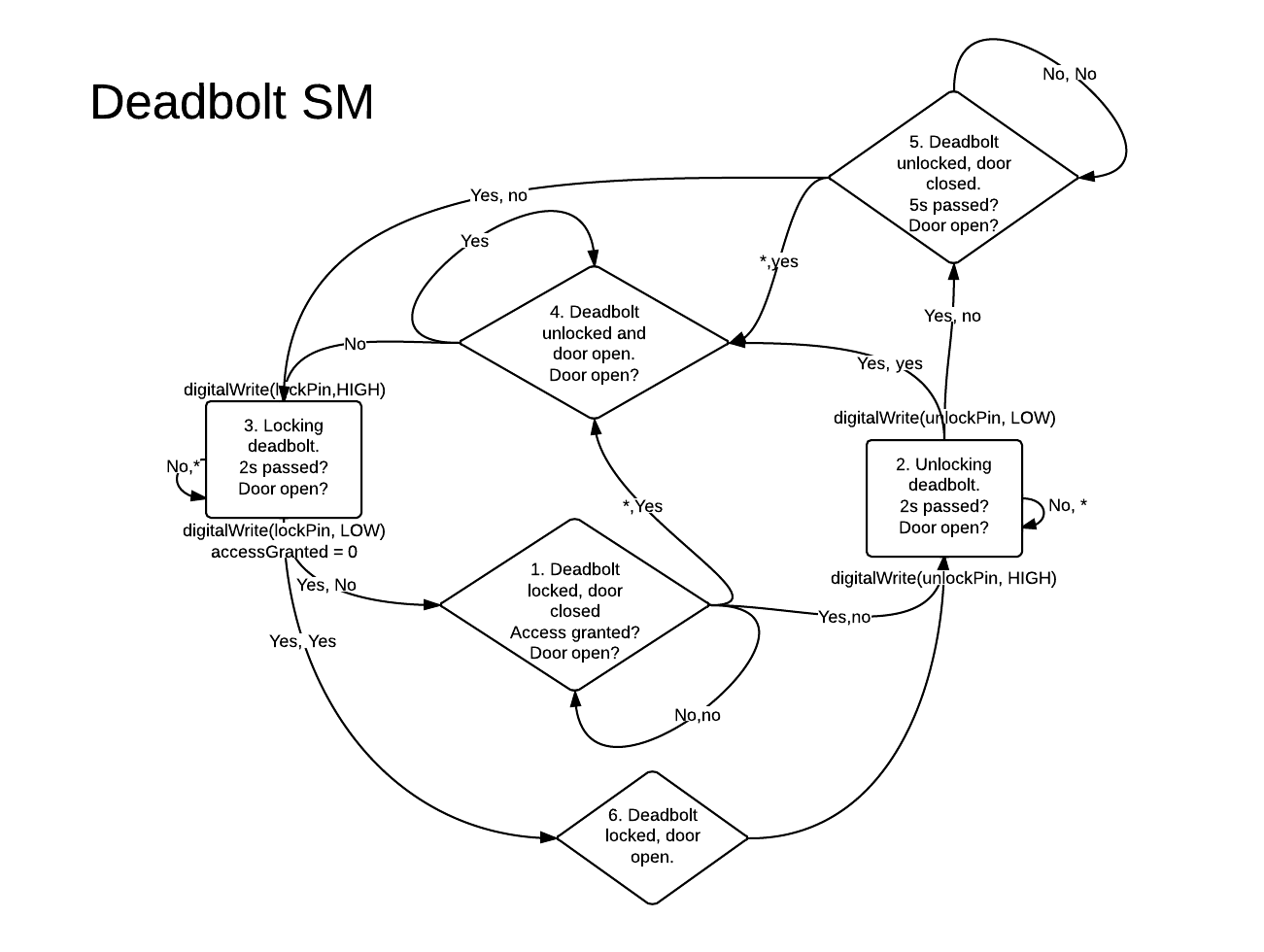 The code for all prototypes including the one at home was very similar. Prototypes 1-3 all used a bunch of if statements that were hard to understand as a whole and missed corner cases. Only in prototype four did I finally use a state machine for unlocking the deadbolt.