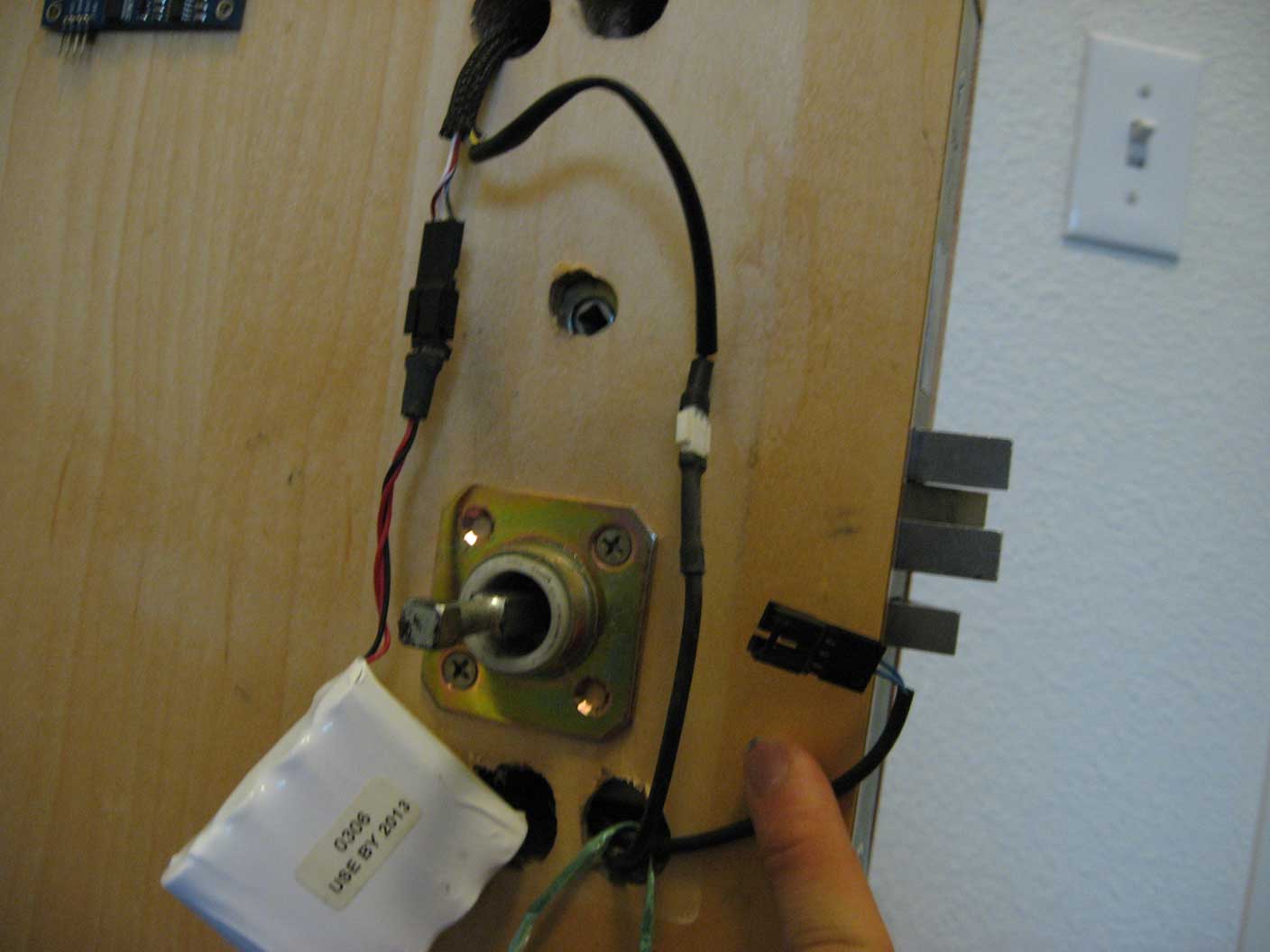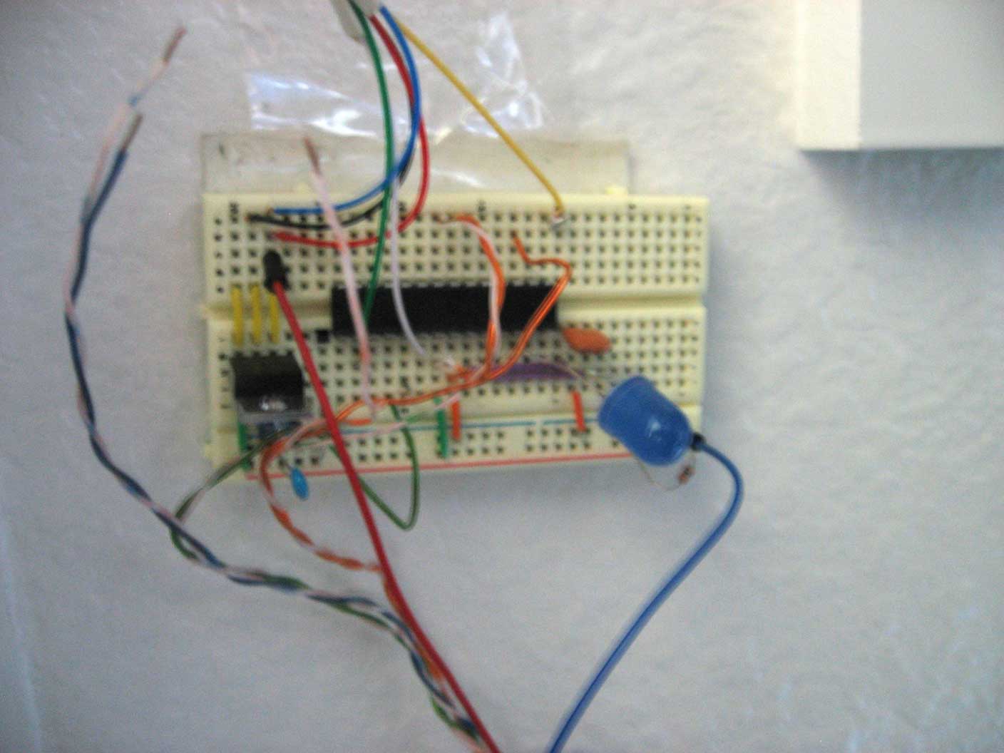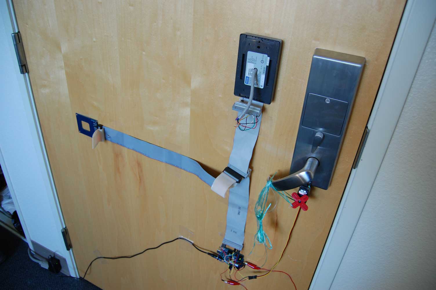 Prototype 2. Notice there is no more reader mounted on the door, rather in the closet. Notice the wire looping around the door.