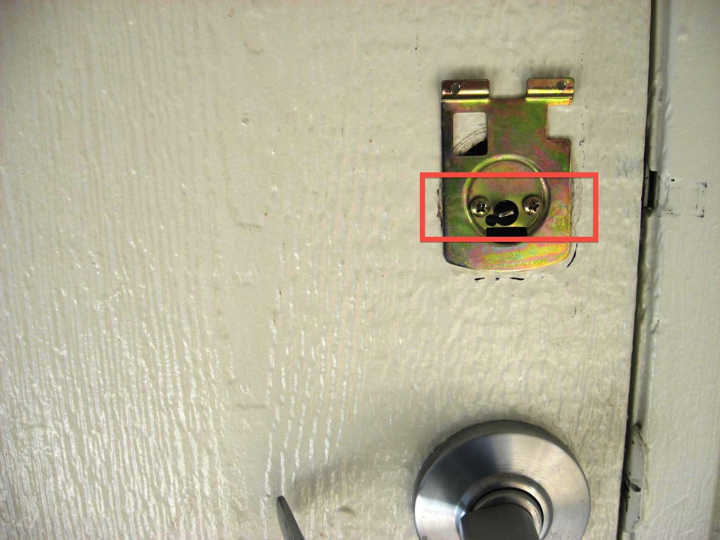 Requirement four was that the lock still needed to be accessible to housing administration. This meant that I had to merge the back of the Morning Industry (MI) lock with the front of the Schlage lock that was already there. When I tried to place the Schlage mounting screws in the MI backplate, they didn’t fit. I had to request that my machine shop friend actually make the holes wider.