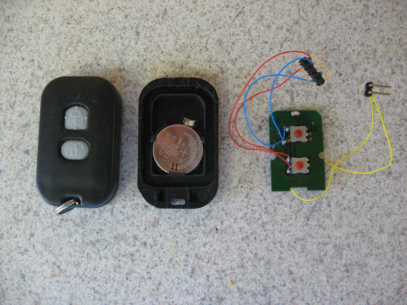 Left: remote. Middle: Battery. Right: disassembled with wires soldered to it.