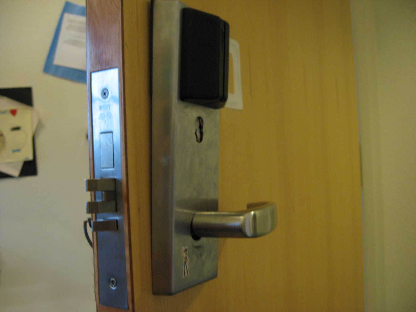 I stayed in a dorm called “Pentland Hills” where you had to open three doors to enter your room. The building door had an RFID reader where you could simply tap your card. The suite and room doors required swiping. The suite door was usually left open, so there was only the room door left. I never wanted to swipe again. Therefore, the electronic door lock was born.