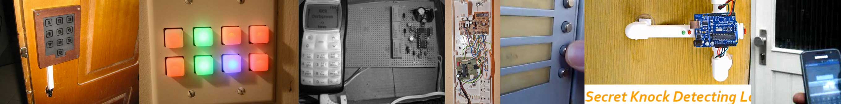 A bunch of different authenticators. Left to right: Twelve-button keypad, RGB keypad, Cell phone, Morse code doorbell, secret knock detector, iPhone app