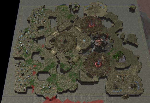 The terrain took a disproportionate amount of my time. I didn’t even place many doodads–I was aiming for functional things like gameplay and not having too much empty space in between. I could have just used one of Blizzard’s campaign maps but then I would have had to rip out all the campaign trigger code and replace it with the co-op template trigger code. Very difficult. Code more important than terrain.